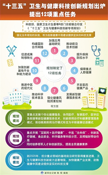 王磊介紹,《規(guī)劃》圍繞健康中國建設(shè)需求,全力推進相關(guān)領(lǐng)域科技計劃(專項、基金等)的實施,共部署5個方面的12項重點任務(wù)。