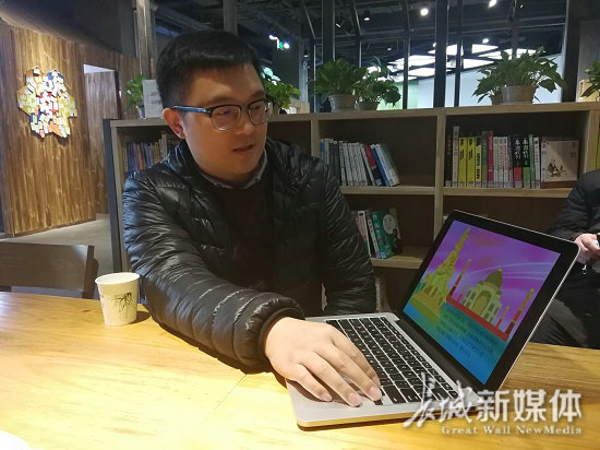 大學生科技創新創業項目評選活動一等獎獲得者代壯博向記者介紹他的獲獎項目《途趣》。記者閆思宇攝