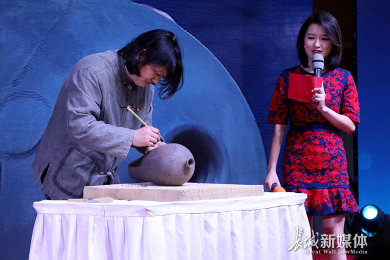 河北曲陽定瓷傳承人龐永輝現(xiàn)場展示陶坯刻花技藝。記者高琳哲攝