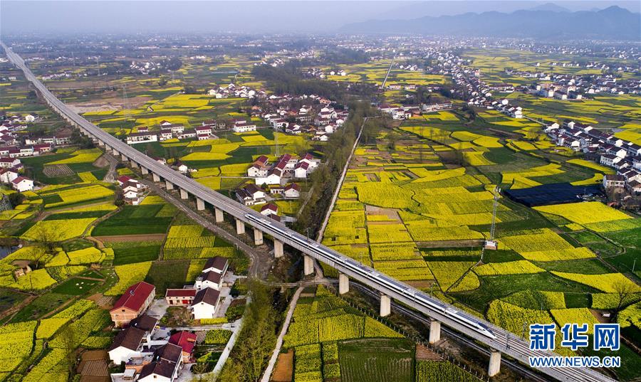 3月21日,一列動車正通過陜西省漢中市南鄭縣新集鎮油菜花海(無人機拍攝)。新華社記者陶明攝