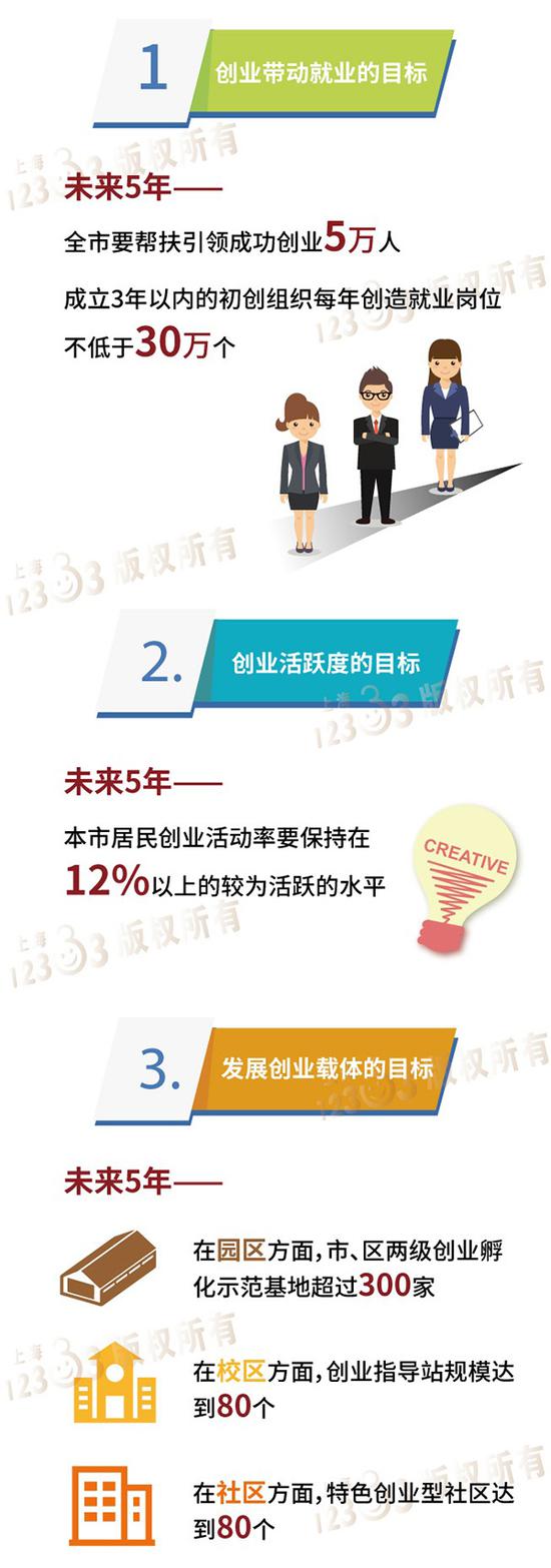 新一輪行動計劃明確了三個維度的目標:一是創業帶動就業的目標,提出未來五年全市要幫扶引領成功創業5萬人,成立三年以內的初創組織每年創造就業崗位不低于30萬個;二是創業活躍度的目標,提出上海居民創業活動率要保持在12%以上的較為活躍水平;三是發展創業載體的目標。在園區方面,市、區兩級創業孵化示范基地超300家;在校區方面,創業指導站規模達80個;在社區方面,特色創業型社區達80個。