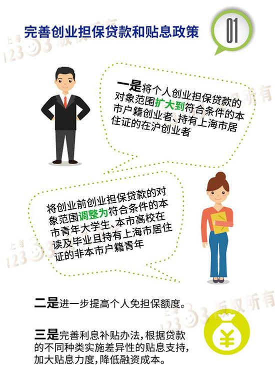 是完善創業擔保貸款和貼息政策。一是將個人創業擔保貸款的對象范圍擴大到符合條件的本市戶籍創業者、持有上海市居住證的在滬創業者;將創業前創業擔保貸款的對象范圍調整為符合條件的本市青年大學生、本市高校在讀及畢業且持有上海市居住證的非本市戶籍青年。二是進一步提高個人免擔保額度。三是完善利息補貼辦法,根據貸款的不同種類實施差異性的貼息支持,加大貼息力度,降低融資成本。