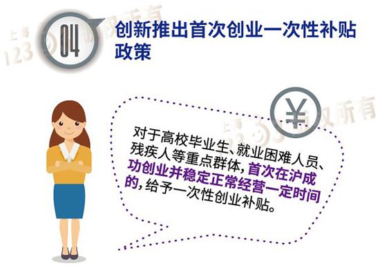 第四是創新推出首次創業一次性補貼政策。對于高校畢業生、就業困難人員、殘疾人等重點群體,首次在滬成功創業并穩定正常經營一定時間的,給予一次性創業補貼。