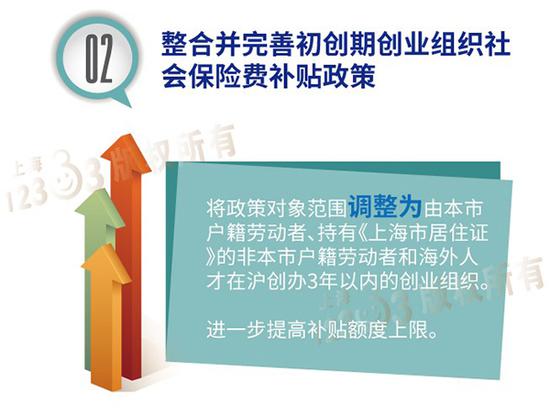 第二是整合并完善初創期創業組織社會保險費補貼政策。將政策對象范圍調整為由本市戶籍勞動者、持有《上海市居住證》的非本市戶籍勞動者和海外人才在滬創辦3年以內的創業組織,進一步提高補貼額度上限。