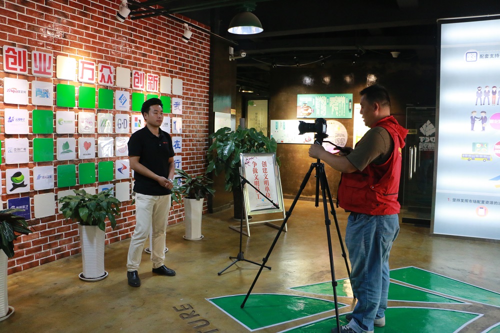 采訪人員首先在DCT創客空間一層創客書吧、項目路演大廳和人才交流展示區進行了拍攝,還采訪了DCT創客空間工作人員周承樸,周承樸介紹了DCT創客空間的服務理念以及今后將更加積極探索優秀的孵化模式,助力更多創客實現夢想。